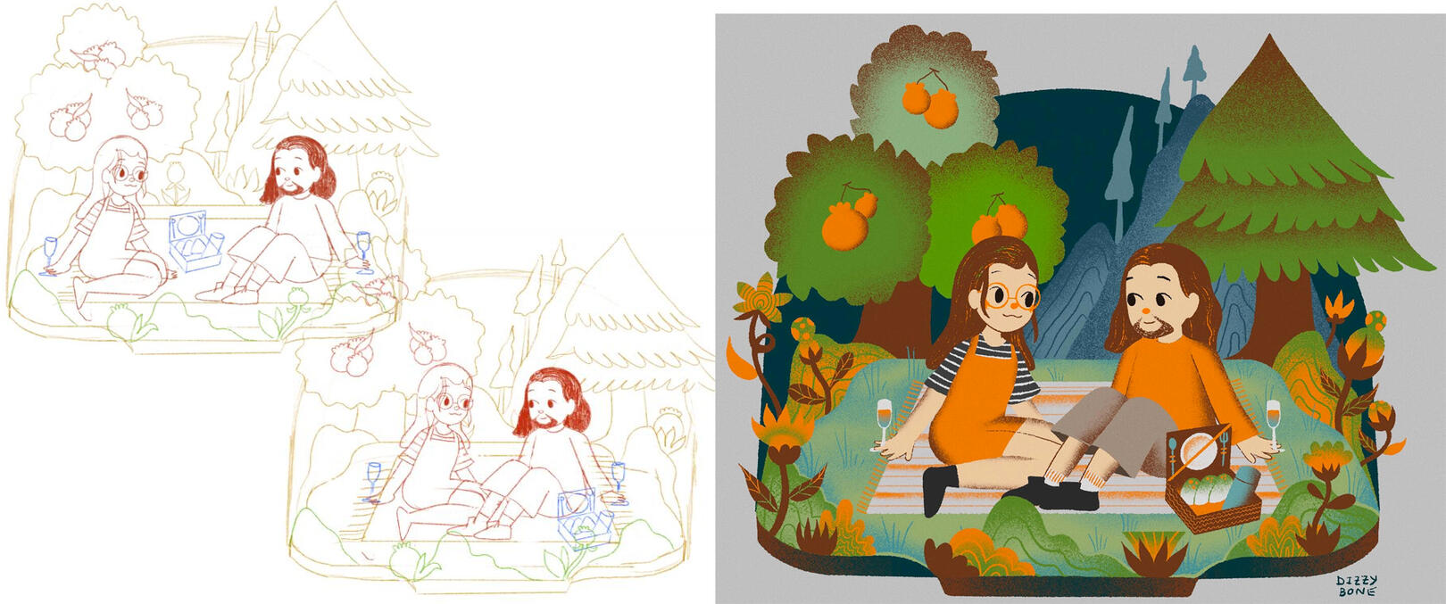 Above is an example of a sketch to finalised artwork! I start off by drawing quick thumbnails and then refine them into a tight sketch which is what the client will see. The sketch will most likely look very similar to the shapes and outlines of the final artwork, although I tend to take more liberties adding extra details if I think it would suit the piece. The backgrounds and environments I like to create are more on the abstract side. I am often inspired by a character's design when creating backgrounds, such as using similar shapes or elements. I am most comfortable with using a limited colour palette, which was influenced by my years of working with traditional printmaking techniques. I make all my drawings on Procreate and Photoshop.